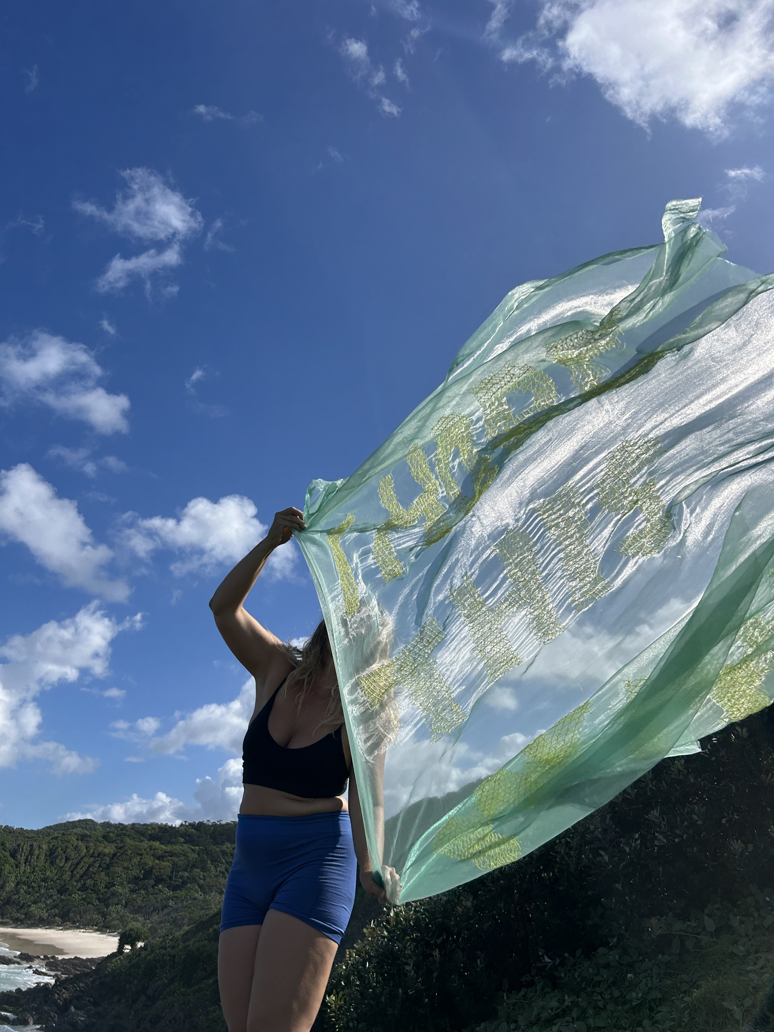 Imagine the Sunrise, 2025 watercolour, hand embroidery on silk, 135 x 60cm